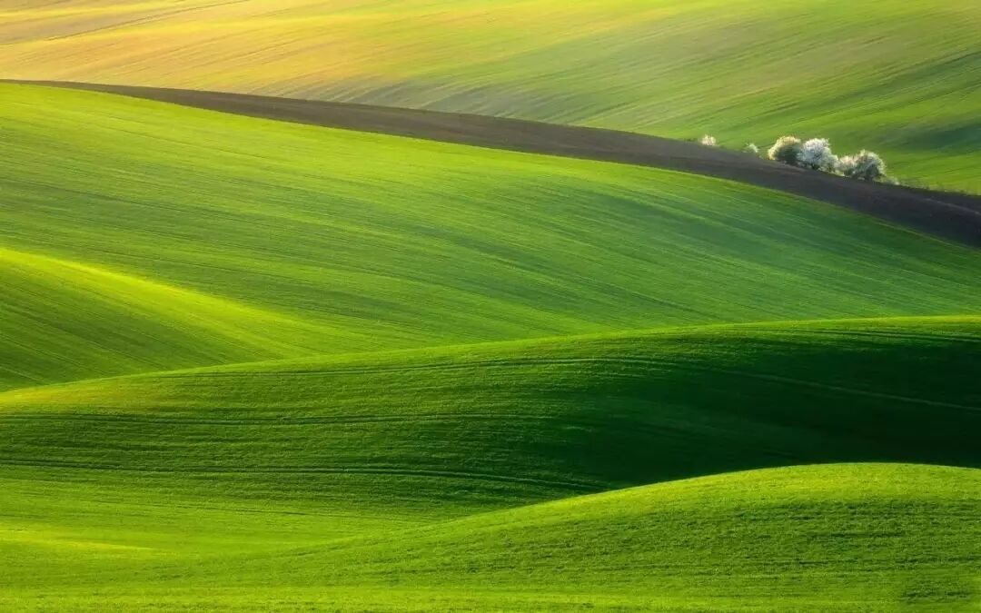 地势平坦而辽阔,在远方有微微起伏,整个大地都被绿油油的草覆盖着,像铺了一层厚厚的地毯,在蓝天的映衬下,显得格外清新。