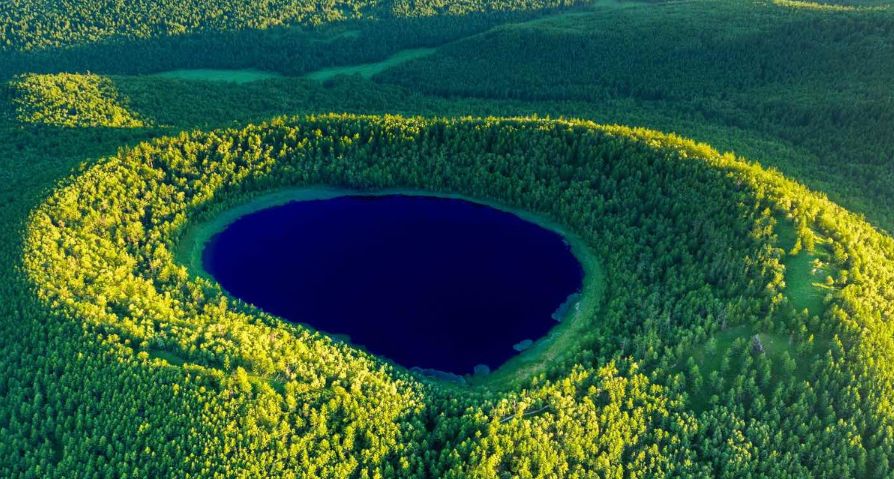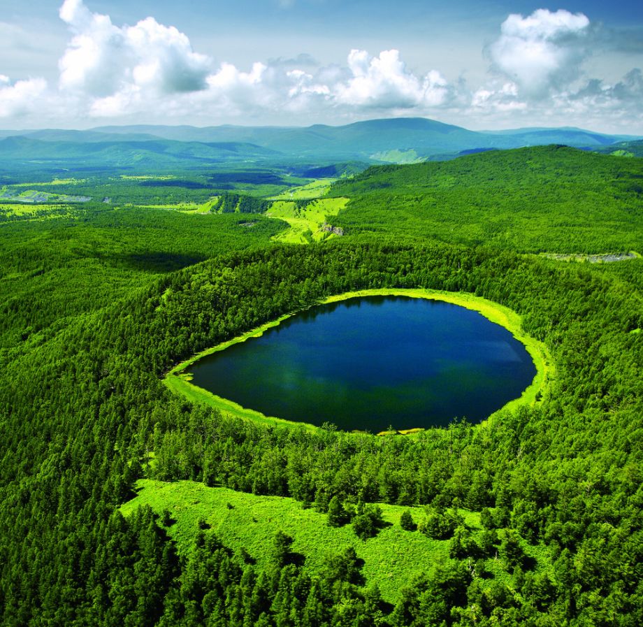 从空中俯瞰,形状似水滴,更像一块晶莹的碧玉,镶嵌在雄伟瑰丽、林木苍翠的高山之巅。