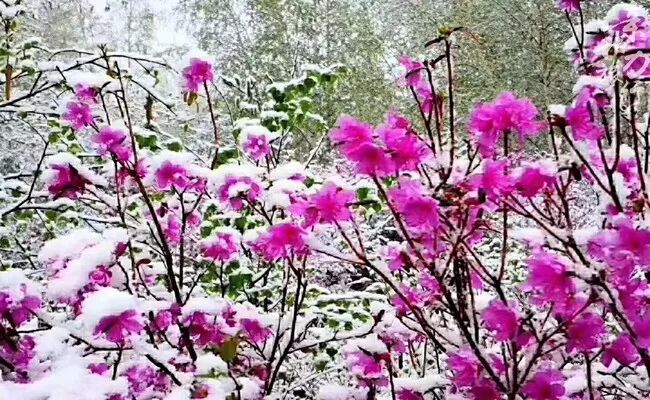 春季,看杜鹃花在萧索暗淡的山脉间争相开放, 粉色的花朵在洁白的雪景中熠熠生辉,即便是被封仍旧肆虐,也遮挡不着这山花烂漫的早春景色!