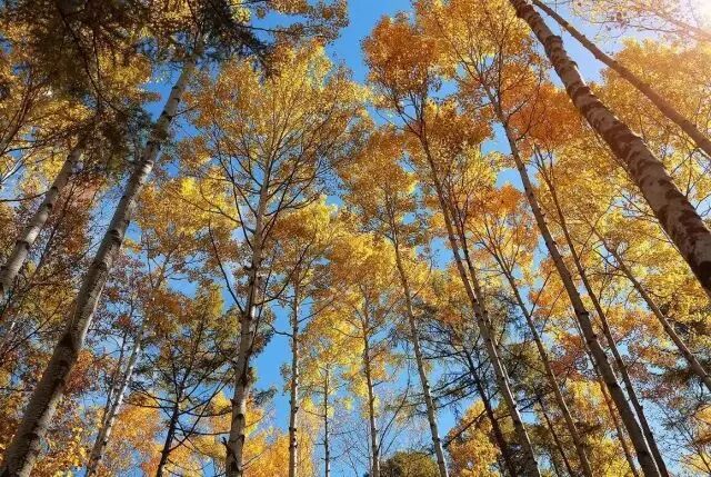 白桦林像幻想中的童话世界,美不胜收,白桦树有点像北方的白杨,挺直、伟岸,如剑戟直向北国长天。