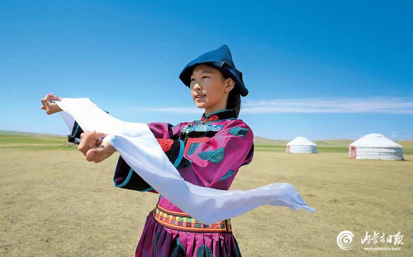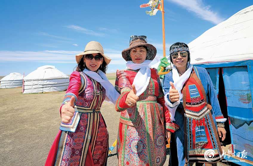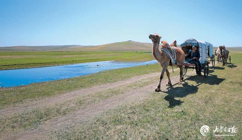 六月下旬的草原美不胜收。当清晨的第一缕阳光洒满辽阔的巴尔虎草原,身穿民族服装的十几位游客与当地牧民一同坐上勒勒车,从莫日格勒河南岸牧云山顶景区出发,闻着青草的芳香,循着河流的足迹,跟随牧民追着太阳“游牧天边”。