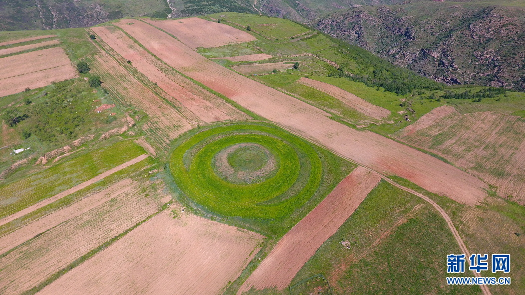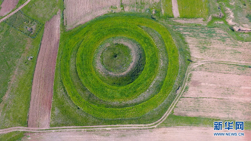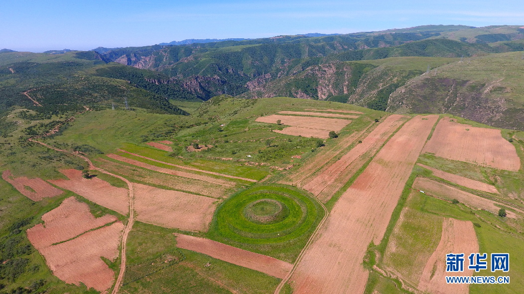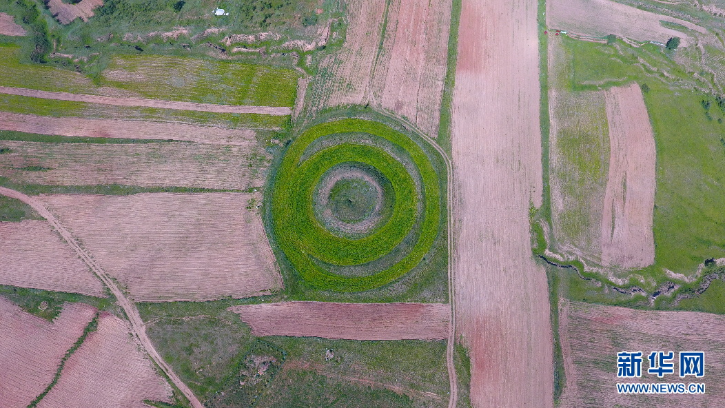 夏日,塞外白道岭环形祭天遗址被绿色覆盖,与周围的农田、蜿蜒的山路、连绵的大青山构成了一幅幅奇妙的图画。新华网发(李立群摄)