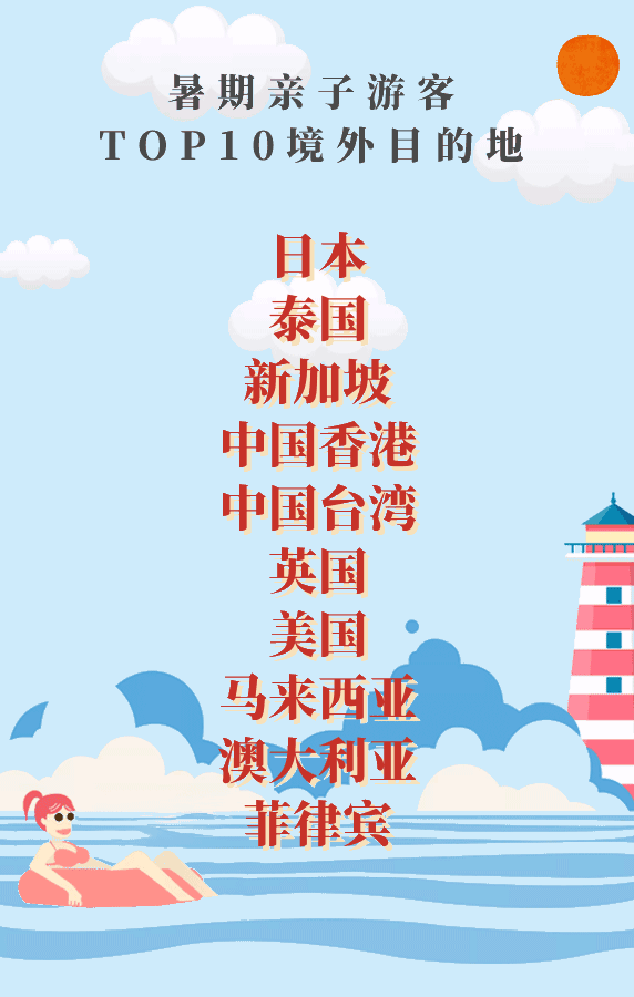 此外,在出境游日渐火热的今天,越来越多的家长选择带孩子出国,感受不一样的异域风情。那么,暑期哪些境外目的地更受追捧?数据显示,日本、泰国、新加坡、中国香港、中国台湾、英国、美国、马来西亚、澳大利亚、菲律宾成十大境外旅游打卡地。