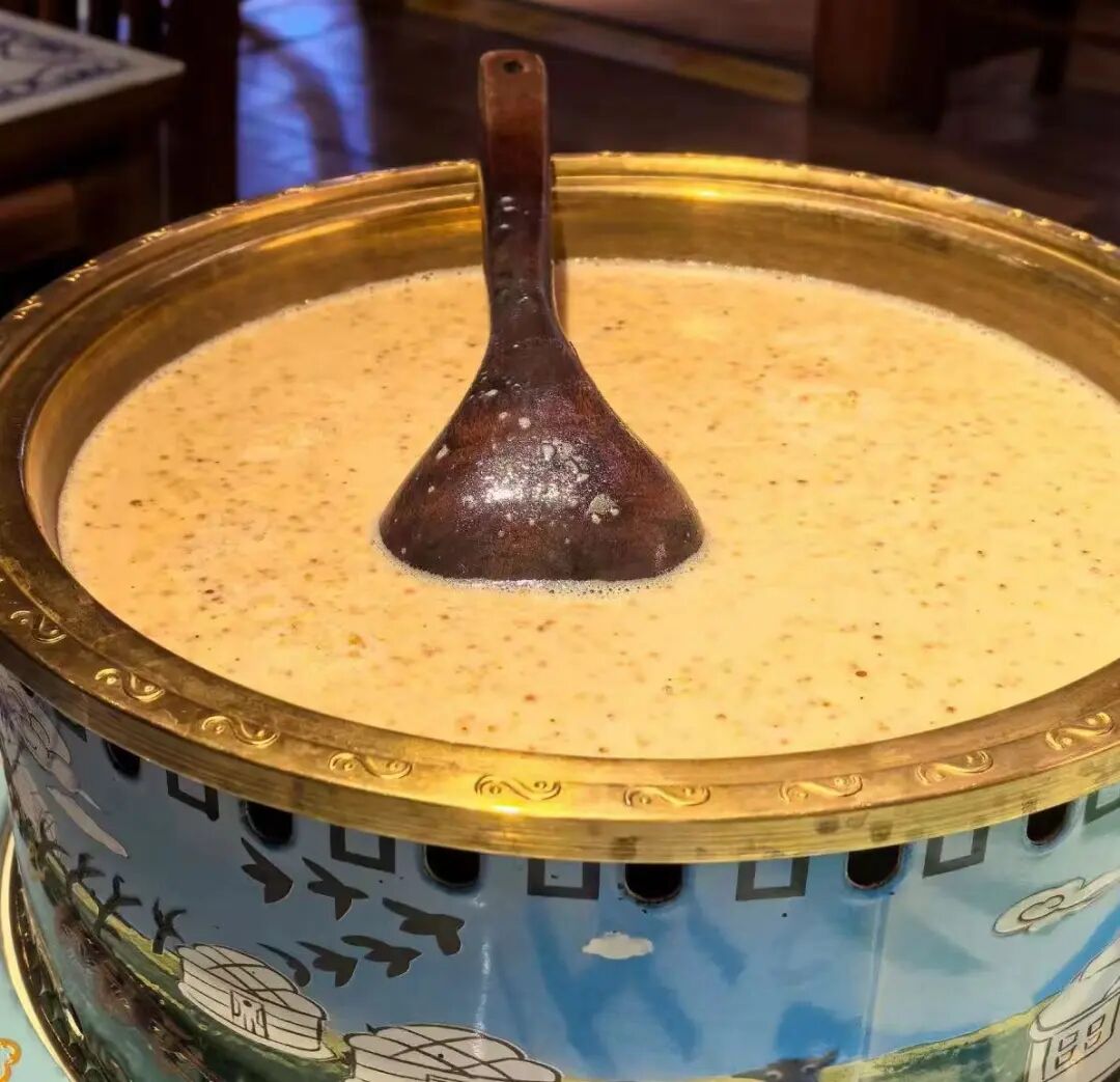 煮锅茶是将在已经熬成的红茶里,放入适量的牛、羊鲜奶,使茶的红变为乳白色即可。锅茶有浓郁的奶香味,可口绵甜,独具风味。