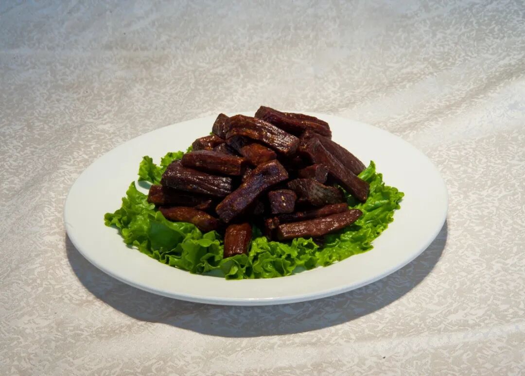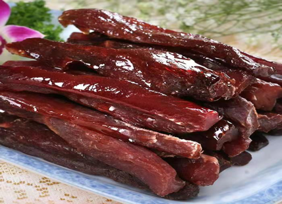 科尔沁牛肉干在保留传统手工艺基础上,精选地产黄牛腿肉,结合现代工艺配料、腌制、晾晒、油炸等工序,创新推出多种口味的科尔沁牛肉干。