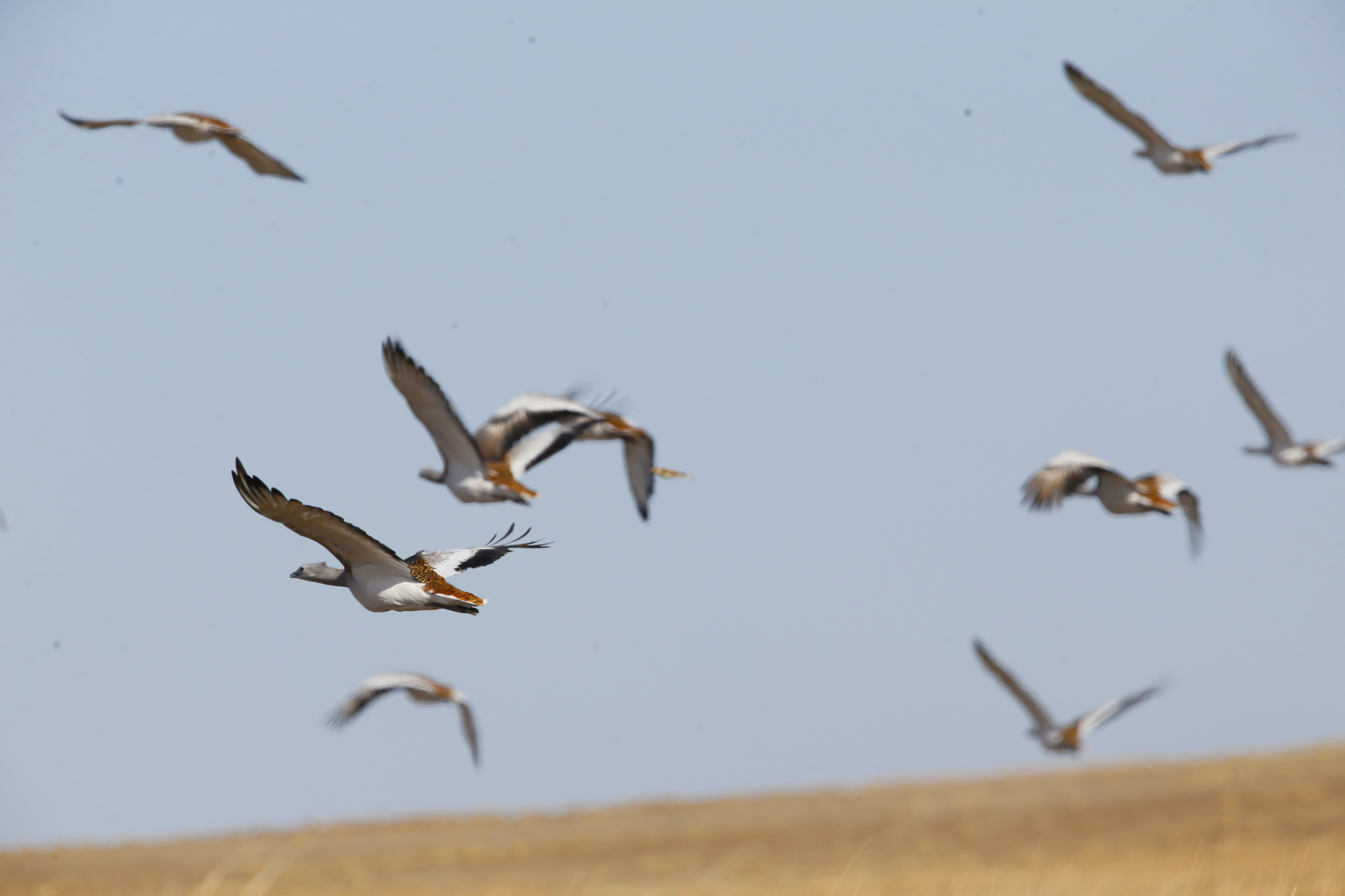 国家一级重点保护动物大鸨集群飞行。