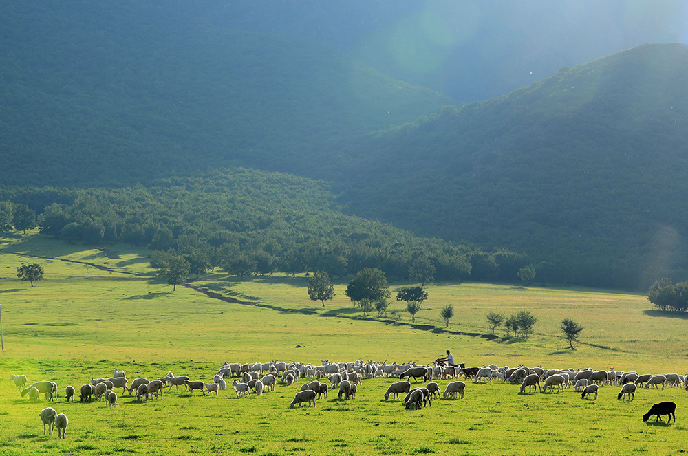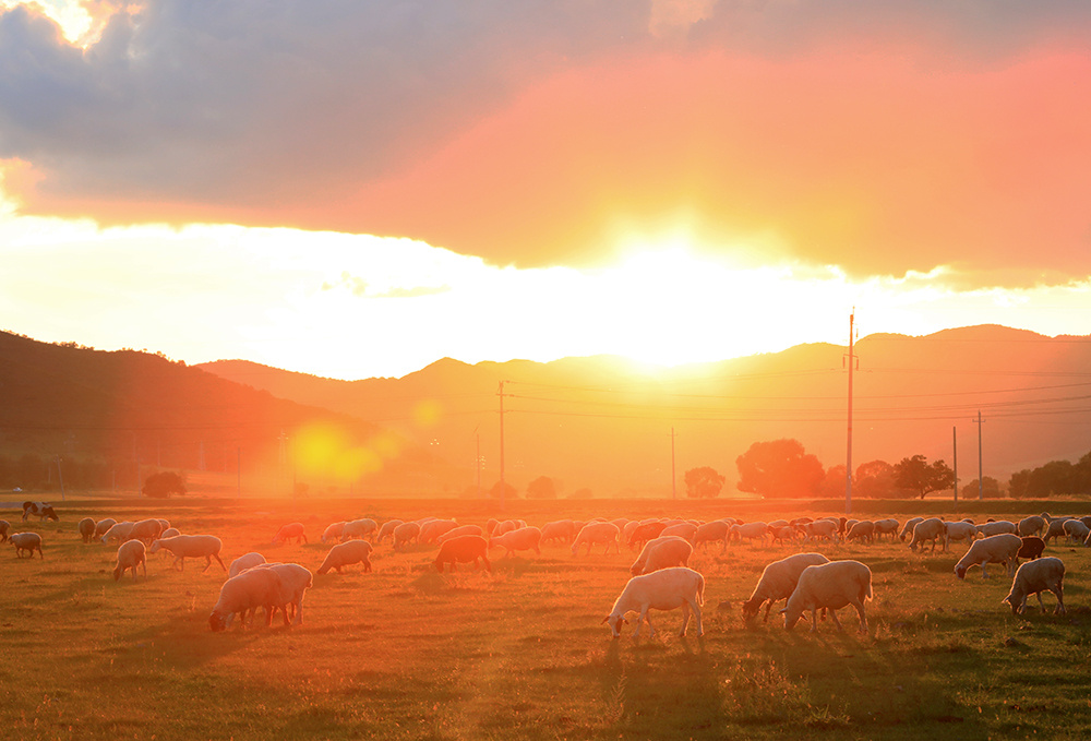 洁白的羊群在夕阳的映照下,仿佛被镀上了一层柔美的金边。