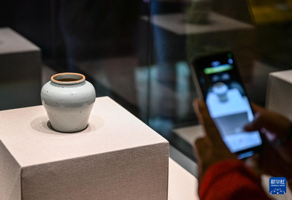 在元上都遗址旁的锡林郭勒盟文化遗产博物馆,游客拍摄展陈的元代瓷器(9月16日摄)。新华社记者 彭源 摄