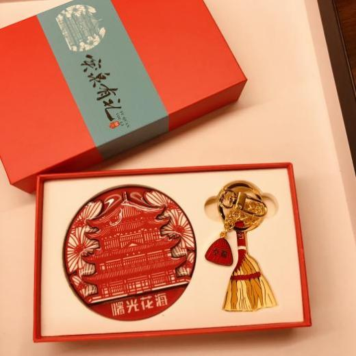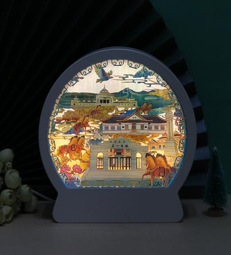 ①春州有礼:现代化的设计风格融合突泉文旅特色元素,设计制作了金扫把钥匙扣、曙光楼优盘、小夜灯等系列文创产品。