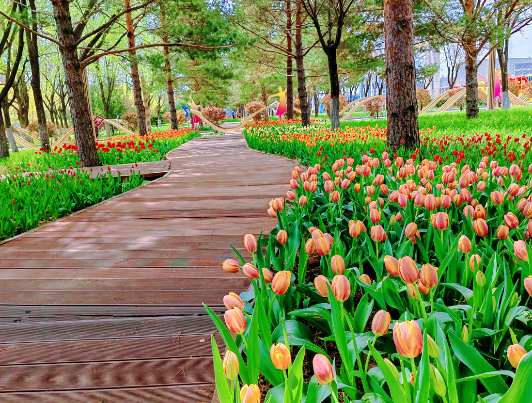 康巴什的绿色是生态杰作,更是艺术的篇章。城区郊外花草树木颜色的搭配及变化,似被打翻的调色盘,也似一幅幅印象派上乘画作。随意走走,无论是在中轴线上,还是在伊克敖包周边或乌兰木伦街沿线等,康巴什都是花草的海洋。 三四月份,雪白的杏花之后是粉红的桃花。五六月份的郁金香、牡丹、芍药,姹紫嫣红、争奇斗艳。七八月时的薰衣草如紫色的水晶,香飘十里。冬日,纷纷扬扬的雪花勾勒出山峦银白的轮廓,而光秃的树枝在风中劲舞……