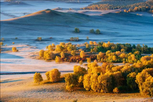 而它的美,从秋天来临开始,一下子爆发出来。最终流入蒙古国的哈拉哈河从这里经过,即使寒冬也不封冻,因此又被称为不冻河。