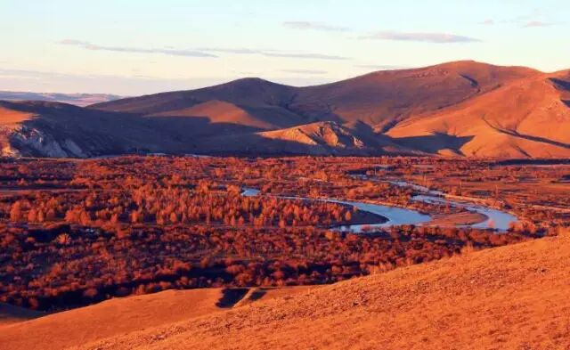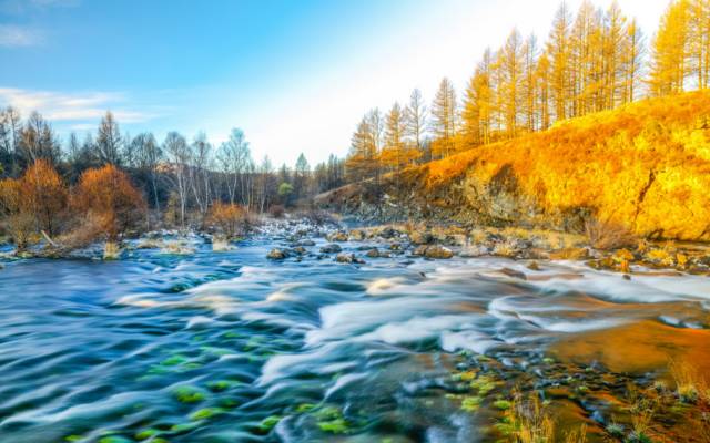 而它的美,从秋天来临开始,一下子爆发出来。最终流入蒙古国的哈拉哈河从这里经过,即使寒冬也不封冻,因此又被称为不冻河。