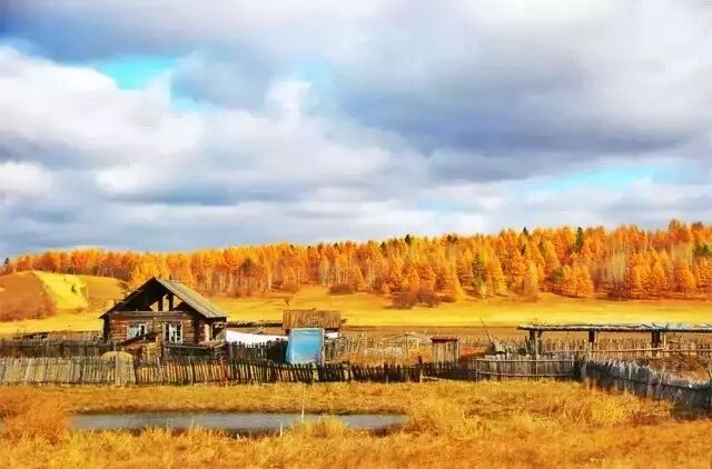 金黄的树林,金黄的草原,木栅栏还有村民们的木房子所组成的画面犹如一幅油画。