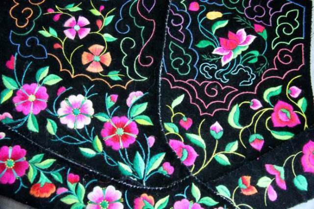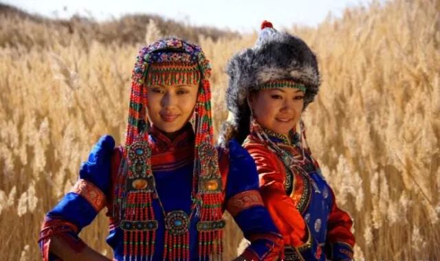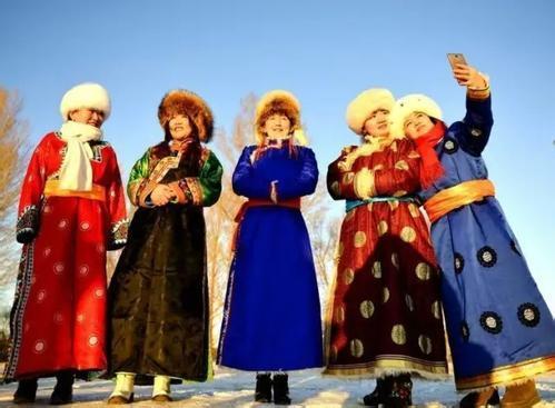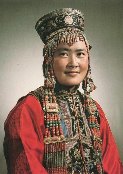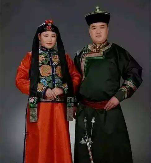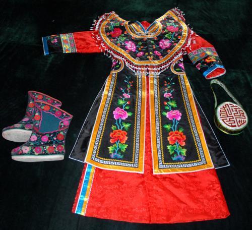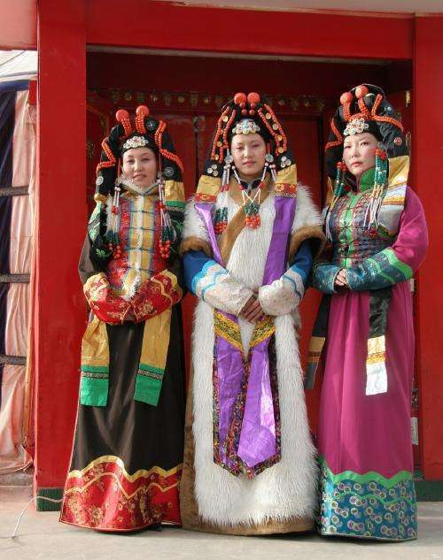 华丽的女士绸缎长袍是阿鲁科尔沁服饰最鲜明的风格。绸缎绣满蝴蝶,牡丹,凤凰等对称图案,高贵富丽。