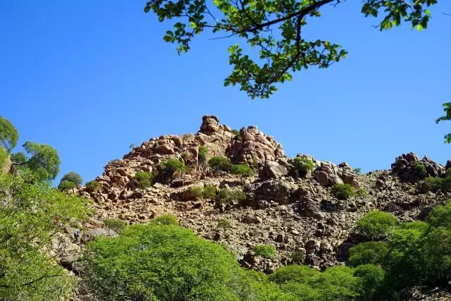 峡谷蜿蜒曲折,榆树、桦树、松柏、蒙椴自由地生长在这里,释放着生动的绿色,山桃、山菊、黄刺玫、野葡萄陪伴在绿色里。