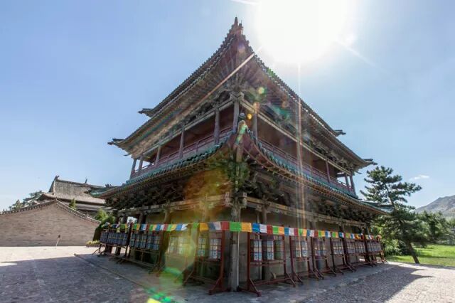 若将镜头拉远,拉远,俯瞰整个中国版图,除了川西与西藏,在内蒙古,塞北高原上,还有一颗红色的点,默然伫立,经幡在塞上的风中猎猎飘动,红顶白墙明艳而沉静,这里没有长长队伍的磕头人,却有着佛家圣地的极致平和宁静,风也空灵,云也空灵。三百多年来,作为佛教四大圣地之一的它,因为身处边塞,少被人记起,于是,在这高原的蓝天烈日下,它独成一派,作为寺院,更享有政教合一特权,作为佛学院,也设有监狱、法庭,并有武装。行走其间,三百多年的风雨未曾侵蚀它的面貌,人世的烟火也为消退艺术品的色彩,藏传佛教之光持续了三百多年,悠扬的诵经声也回响了三百多年,并将继续回响下去。