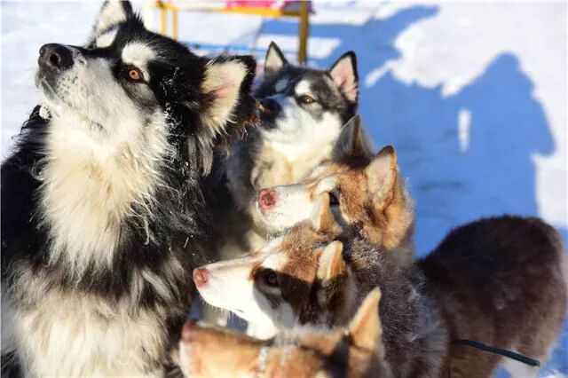 狗狗们在冰上也不敢走路。