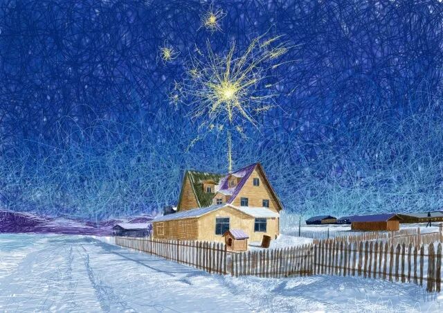 冬夜里的恩和处处透着边境小镇的那股神秘,远处的木刻楞里透出微弱的光,屋顶升起的白烟让人心生暖意。借着皎洁的月光,可以隐约看到静止在冰雪中,像雕塑一样的马群,它们身后的半空中,是群山连绵不断的轮廓。