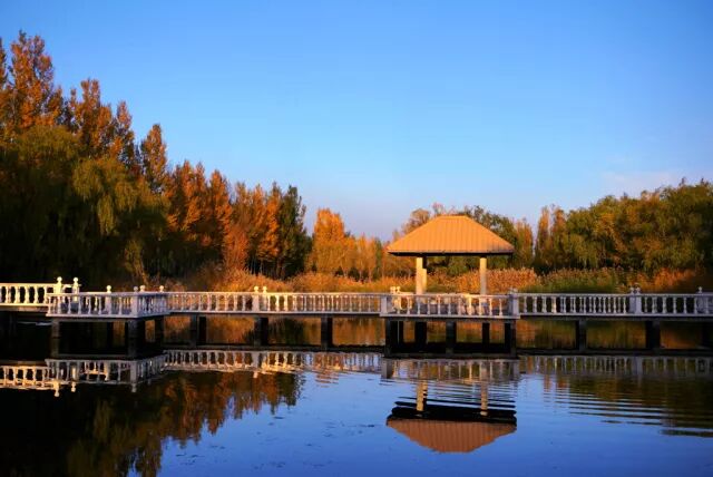 恩格贝的秋,淡定与宁静刻在每一棵树上,恩格贝的树是一丛一丛的,枝丫和枝丫缠绕在一起,树叶和树叶搅和在一起,荒芜到了繁茂的地步,满目沧桑却盘根错节!刚刚好的秋色,坐在湖边的吊桥,听歌或者看书,都不显得突兀。
