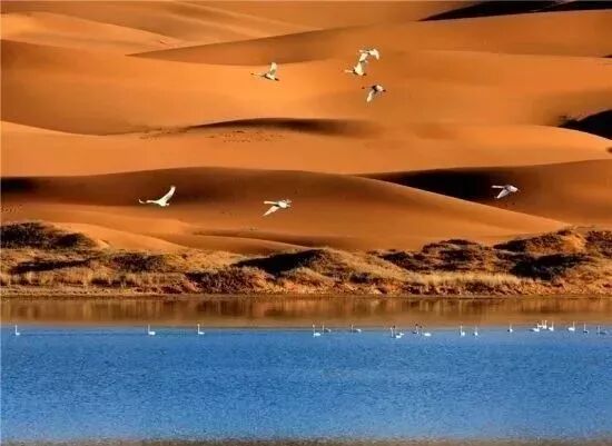 深秋的沙漠并不只有秋雪在绽放美丽,大批天鹅从遥远的西伯利亚降临在七个湖泊如星斗般点缀的库布其国家沙漠公园天鹅湖畔,在大漠绝美风光之下,成群的天鹅让这里的深秋变得浪漫多情。