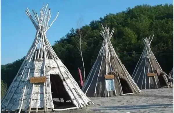 鄂伦春族人的物质生活极具特色。除食肉、衣皮外,过去的住所“仙人住”亦是狩猎文化的一种创造。“仙人柱”形同半张开的雨伞,由30多根树杆塔成,外面夏季覆盖桦皮,冬季覆盖兽皮,可很快搭成,可随时拆卸。