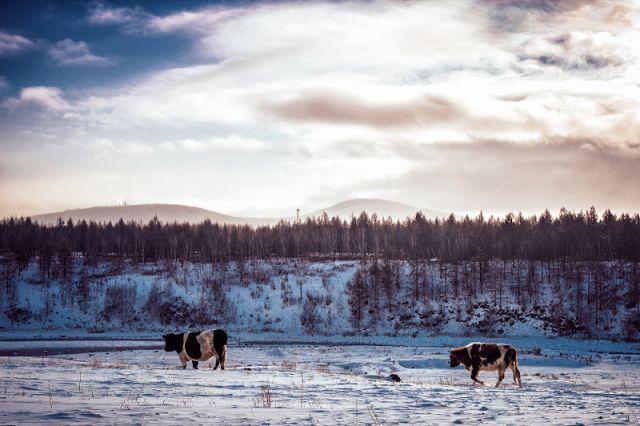 当窗外的景致由高大的樟子松和白桦林逐渐变成平坦的茫茫雪原,那就说明我们已经来到了呼伦贝尔大草原。整个世界只剩下一尘不染的白色,明净而单纯,触摸过草原的冬天,才能理解严酷自然面前生命的坚韧。赶到鄂温克草原上的布里亚特蒙古人家时已是正午,热情的主人用诚意满满的蒙餐招待大家,落日下的布里亚特人骑着骆驼向我们缓缓走来,坚定而神圣。