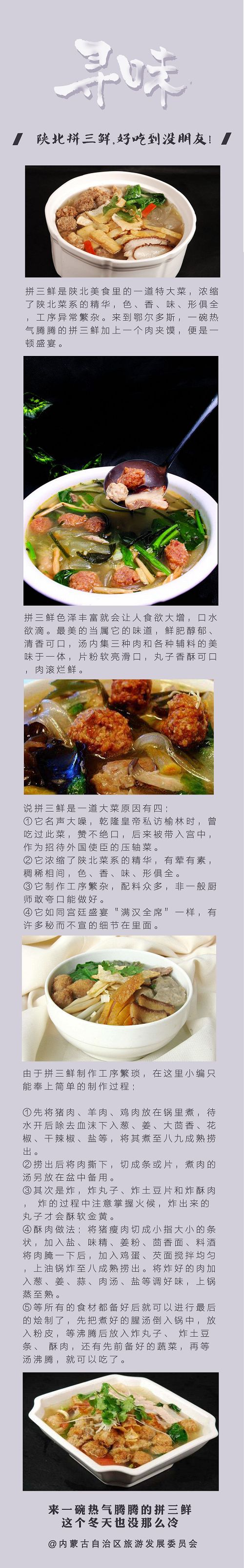 拼三鲜是陕北美食里的一道特大菜,浓缩了陕北菜系的精华,色、香、味、形俱全,工序异常繁杂。据说,乾隆皇帝私访榆林时,曾吃过此菜,赞不绝口,后来被带入宫中,作为招待外国使臣的压轴菜。现如今,由于地理位置相近,来到鄂尔多斯便可品尝到正宗的拼三鲜。“三鲜”指的是猪、羊、鸡三种肉,家常的食材,需要经过煮、烧、炸、涮、烩等多种烹饪技巧的历练,接受二十三道复杂工序的考验,才能化身丸子、酥肉、鸡丝、肉条等多种丰富的形态。话不多说,来看看这个陕北菜系的“扛把子”吧!