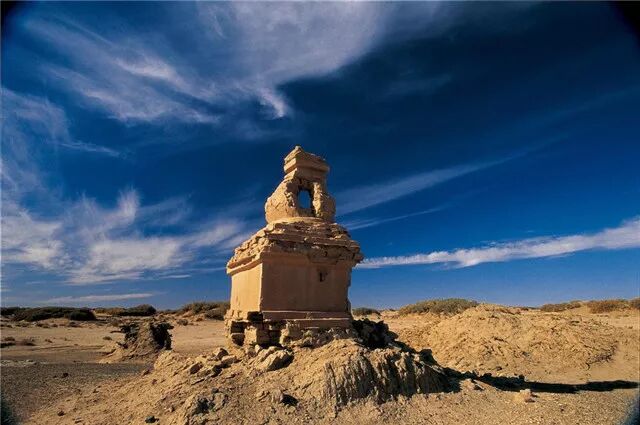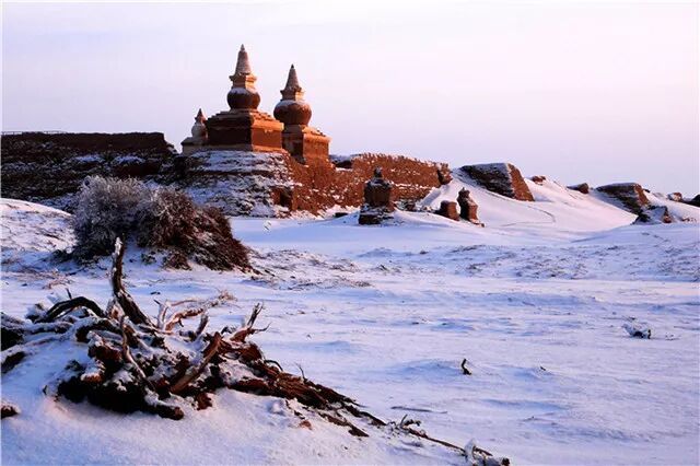 整体呈现长方形的城池,总面积为18.05万平方米。城墙西北角上,屹立着覆钵式佛塔,最高的一座为12米,成为黑城的独特标志。据说,黑城的佛塔是用来存放“擦擦”泥佛的,擦擦用黄泥擦擦压制而成,擦擦四周有佛雕像,玲珑而逼真,每一个擦擦都有一小纸条,打碎擦擦,就能看到纸条上的文字,这文字通常是信徒生前的姓名。