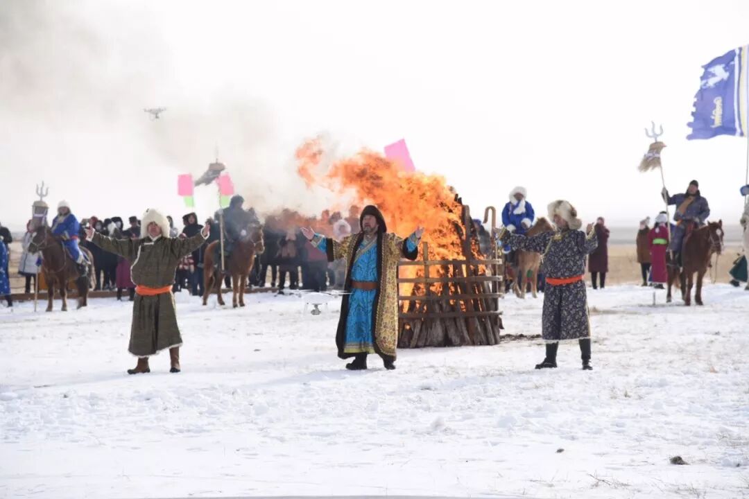 风俗:祭火时用的火撑子蒙古语叫突力嘎,是一种腰缠三箍,上有四个支撑点的火架子。有的不用火撑子,便在火盆里搭起四边形干柴架。把蓝、白、黄、红、绿五彩布条,挂在火撑子或木柴的四眉上,分别代表蓝天、白云、黄教、红火、绿色的生命。