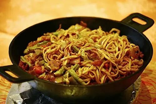 焖面是内蒙古中西部人喜欢的家常面食,主料是面粉,配料主要是豆角和肉。其他随自己喜好而加。