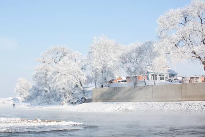 这里树形奇特,沿江的垂柳挂满了洁白晶莹的霜花,江风吹拂银丝闪烁,天地白茫茫一片,仿佛是被尘世遗忘的仙境。