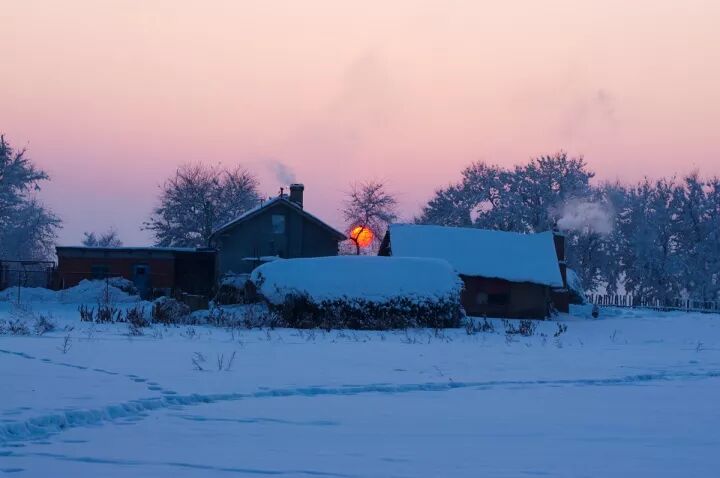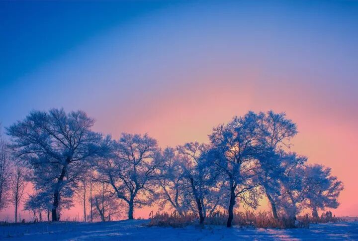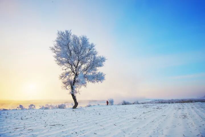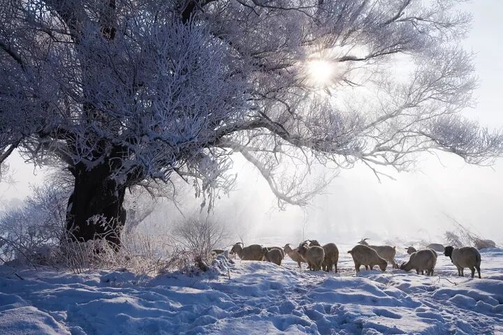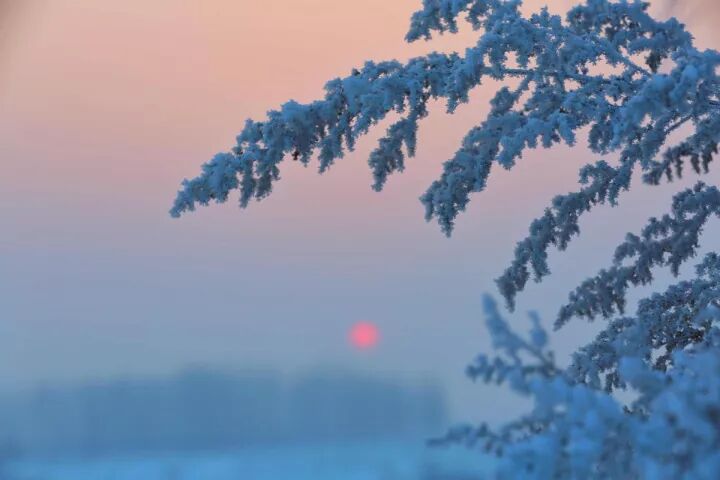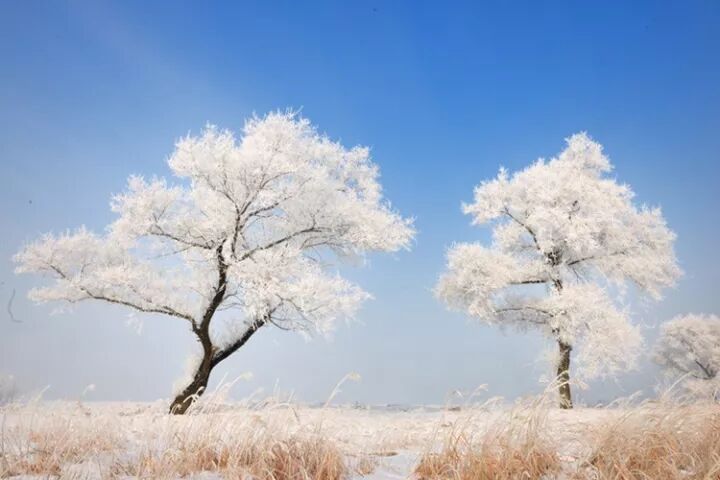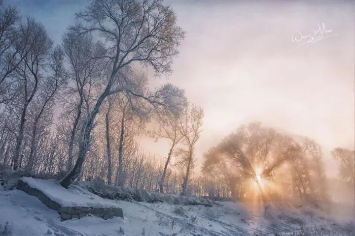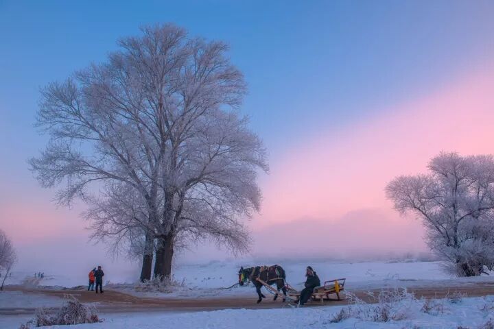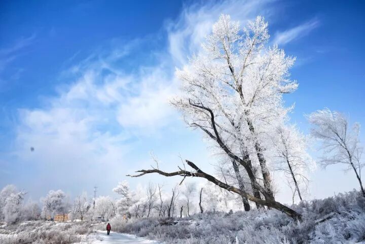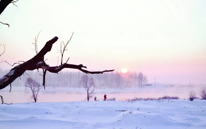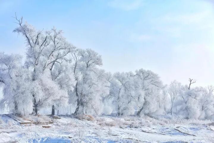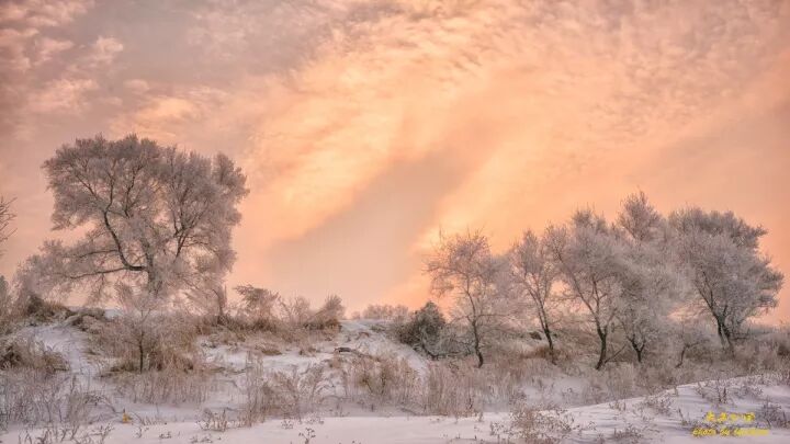 柳树结银花,松树绽银菊,那片如梦似幻的白色世界,在日出的霞光和日落的美奂中,仿佛让人忘却了最真实的人间。