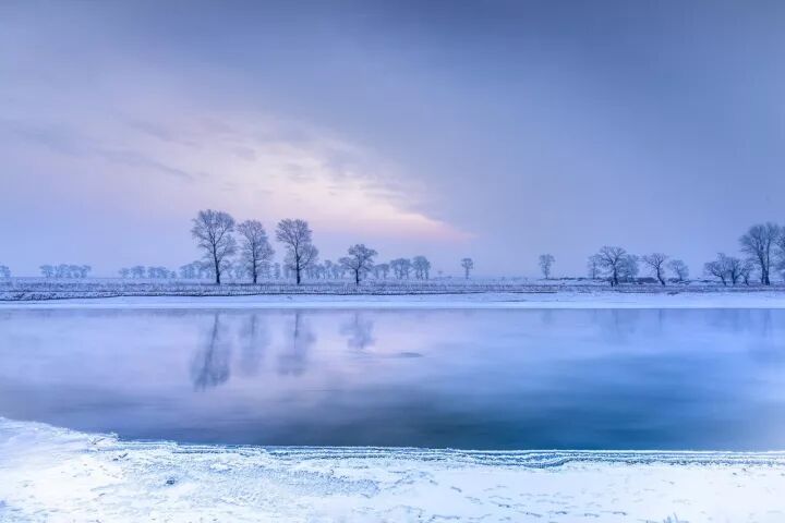 天刚蒙蒙亮,松花江静静地流淌,远处是树干枯的枝桠。江上水雾缭绕,对岸的景色若隐若现。一阵风吹来,水雾四散,如同身处仙境一般。
