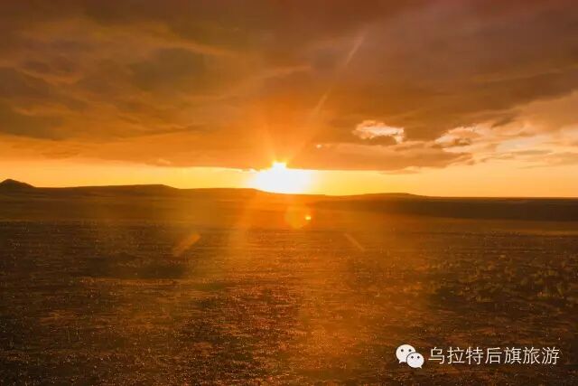 乌拉特草原的落日,同样有草原英雄般的灿烂辉煌。天边的落日,在一望无际的坦荡草原上,放出万道金色的霞光,如同英雄射出的万丈金箭,洋溢着射雕英雄的万丈豪情。有人说,草原的落日,比草原的日出更为壮烈辉煌。