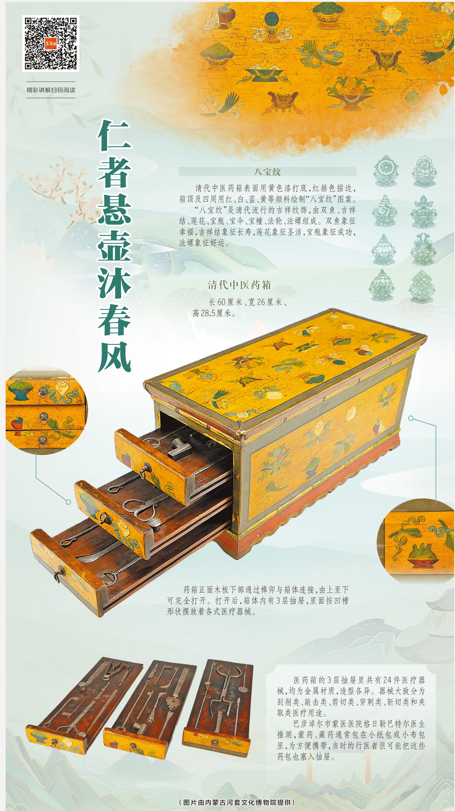仁者悬壶沐春风。凝视这套清代中医药箱,无论是箱体上的精美图案,还是它抽屉里为医疗器械量身雕刻的凹槽,还有金属医疗器械,让我们不仅感受到杏林春暖,更感受到民族文化融合的魅力。(草原云·正北方网记者 高莉 通讯员 高奇峰)