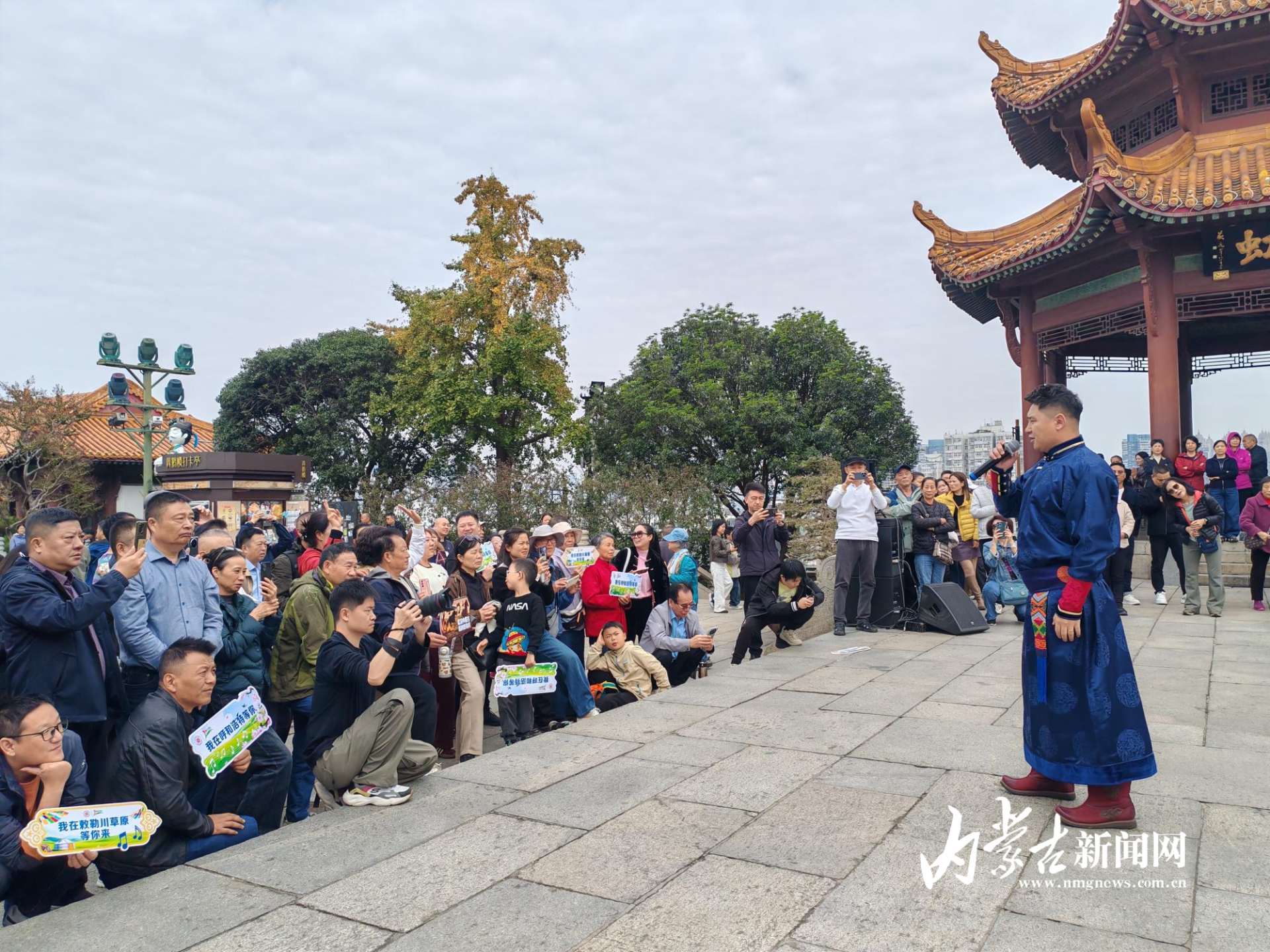 11月12日上午,呼和浩特乌兰牧骑来到黄鹤楼脚下。当来自草原的《酒歌》在黄鹤楼脚下唱响,北疆风韵与荆楚文化有了一次奇妙的碰撞。当日,呼和浩特乌兰牧骑敕勒格尔乐团为当地群众和游客们带来了3首原创歌曲。