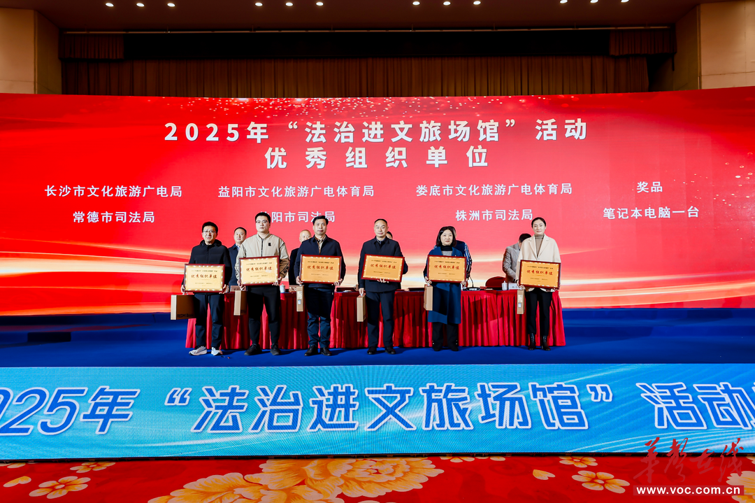 会上表彰了2025年“法治进文旅场馆”活动中表现突出的娄底市文化旅游广电体育局、常德市司法局等6家优秀组织单位,长沙融通长城宾馆、娄底市图书馆等21家先进单位,长沙县图书馆郭紫、湘南学联纪念馆闵巧等10位先进个人,第五届湖南省“诗和远方·与法同行”演讲比赛的28名获奖选手。