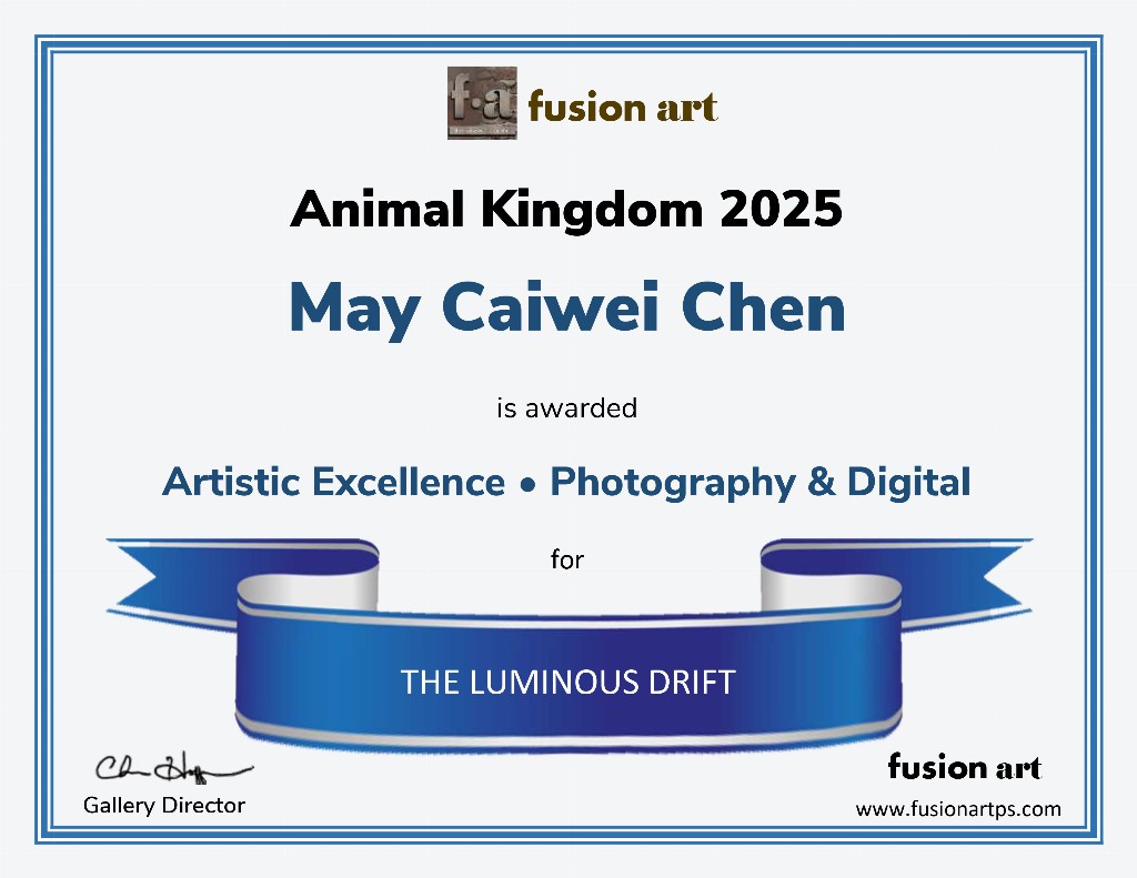 近日,美国Fusion Art画廊举办了主题为“Animal Kingdom 2025(动物王国)”的第十届年度国际艺术展览。艺术家陈采薇的彩色摄影作品《The Luminous Drift(流光漂游)》在其中荣获摄影类“艺术卓越奖”并成功参展。本届展览吸引了来自美国、加拿大、英国、中国、法国、澳大利亚等国的数百件投稿,涵盖绘画、摄影、数字艺术与三维创作等艺术形式。陈采薇的作品以独特视觉与深邃意象脱颖而出,展现出当代艺术对自然生命与生态美学的多维思考。