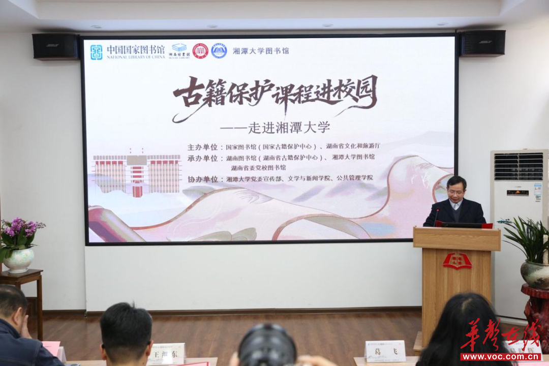 华声在线12月8日讯(通讯员 邓菁岚 万巧燕)今天,由国家图书馆(国家古籍保护中心)、湖南省文化和旅游厅主办,湖南图书馆(湖南省古籍保护中心)湘潭大学图书馆与湖南省委党校图书馆共同承办的“古籍保护课程进校园”活动走进湘潭大学。