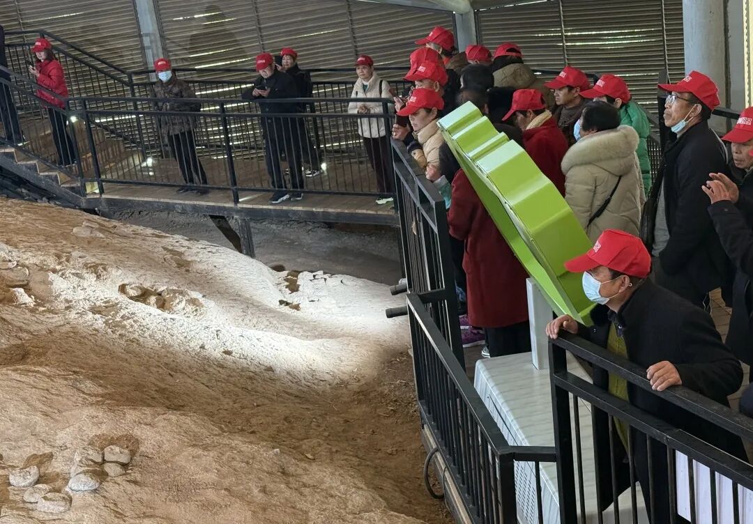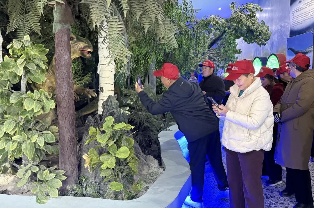 此次前来游玩的会员朋友们,大多是精神矍铄的“70后”长者。在园区内,他们跟随着讲解员的步伐,漫步在蕴含亿万年时光的地质长廊中。面对数量众多、形态各异的恐龙蛋化石,老人们充满了好奇与赞叹,仿佛穿越回了那个神秘的恐龙时代,纷纷驻足观看、拍照留念。