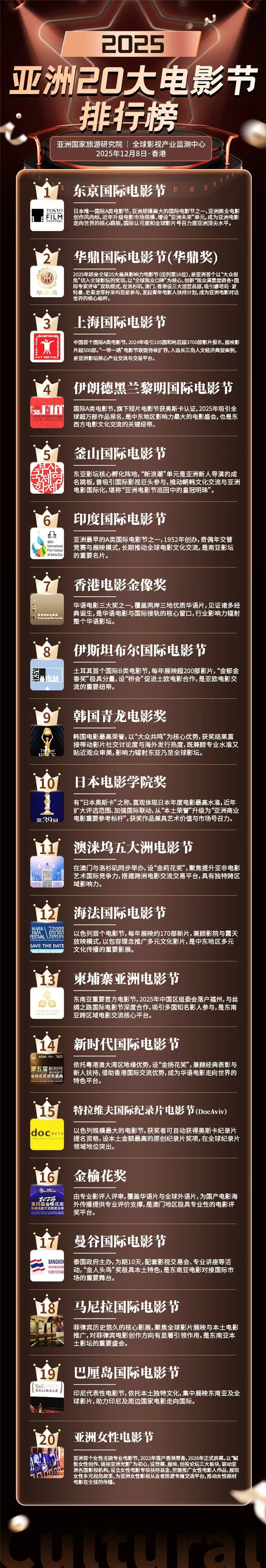 近日,亚洲国家旅游研究院联合全球影视产业监测中心正式发布“2025亚洲20大电影节排行榜”。榜单以国际认证等级、产业规模、全球传播力及行业口碑为核心评价维度,全面呈现亚洲影坛多元发展格局。其中,(华鼎奖)华鼎国际电影节、上海国际电影节等中国及中国澳门地区的电影节强势跻身前列,与东京国际电影节、伊朗德黑兰黎明国际电影节等老牌盛会共同领跑,彰显中国影视产业在亚洲乃至全球的核心影响力。
