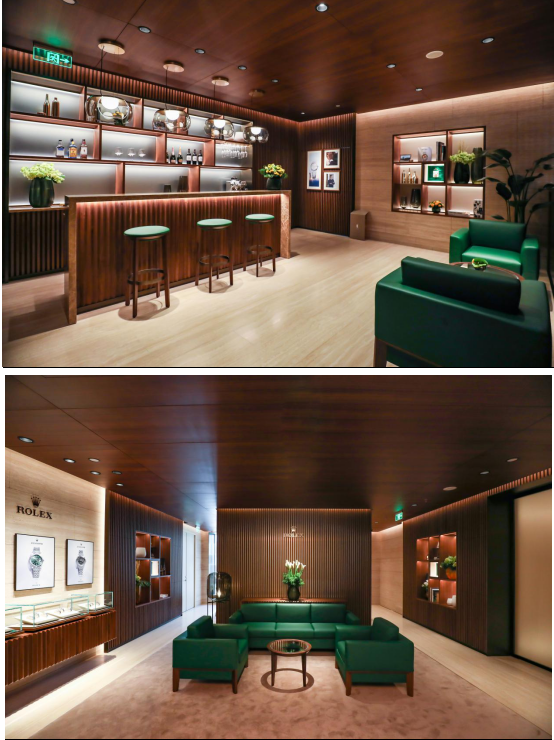 作为劳力士店铺中少见的双层精品店,新店在空间布局上巧妙构建了一条“从历史底蕴通往生活方式”的探索动线。一层大厅设有国内目前面积最大的劳力士标志性绿墙,天然纹理与极致精美的拼接工艺,是品牌严谨制表精神的空间化表达。与之相对应的另一面展示墙将劳力士的精密机械美学与艺术想象力完美展现。值得一提的是,这面展示墙的保养工艺要求极高,其存在本身,即是对店内极致服务标准与维护能力的自信体现。
