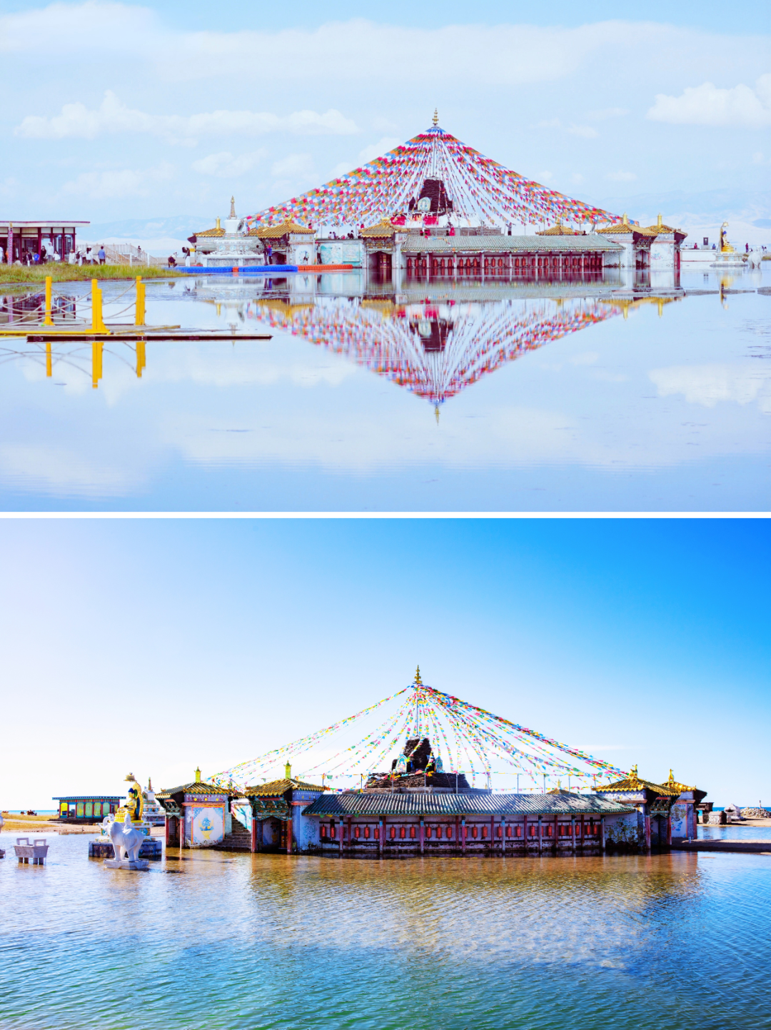 坐落半岛的高原圣湖坛,以简洁庄重的姿态伫立在湖畔。这里没有喧嚣,只有经幡随风轻动,与湖水的低语交织成自然的旋律。