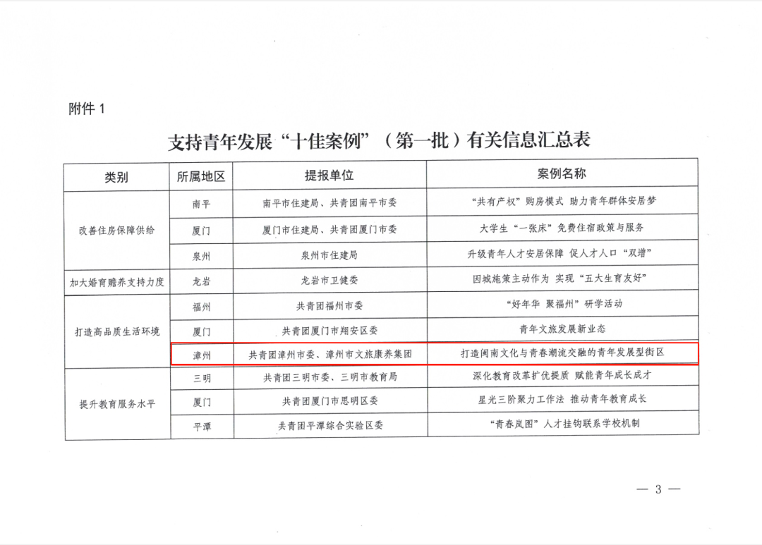 近日,福建省青年工作联席会议办公室印发《支持青年发展“十佳案例”(第一批)》通知,由共青团漳州市委、漳州市文旅康养集团打造的漳州古城青年发展型街区成功入选,成为全省首批聚焦青年发展的典型实践样本。